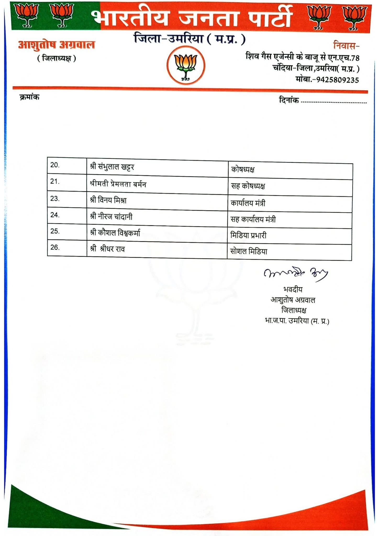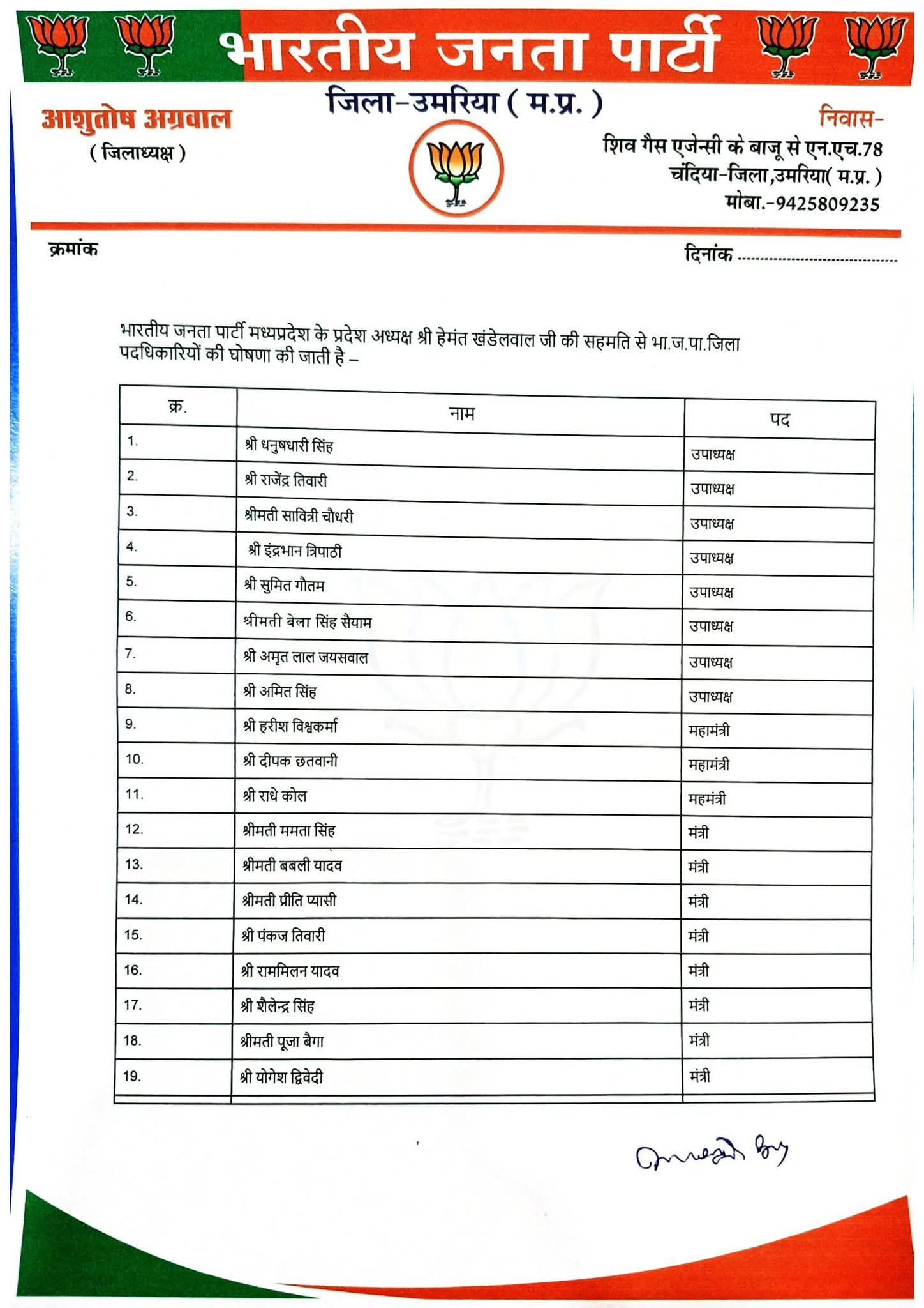 भारतीय जनता पार्टी मध्यप्रदेश के प्रदेश अध्यक्ष की सहमति से भाजपा जिला उमरिया की नई जिला कार्यकारिणी की घोषणा कर दी गई है। यह सूची भाजपा जिला अध्यक्ष आशुतोष अग्रवाल द्वारा जारी की गई है। घोषित कार्यकारिणी में संगठनात्मक संतुलन के साथ विभिन्न वर्गों को प्रतिनिधित्व दिया गया है।